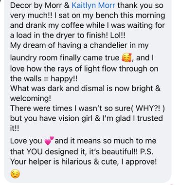 I love the experience I've had with Decor by Morr! Kaitlyn is so talented and works with each client to style a room that is very personalized to their tastes. She can work with any budget and no project is too big or small! We had her work on a fireplace for us and we are already working on a second project with her. Kaitlyn is kind and professional and you won't be disappointed!!!